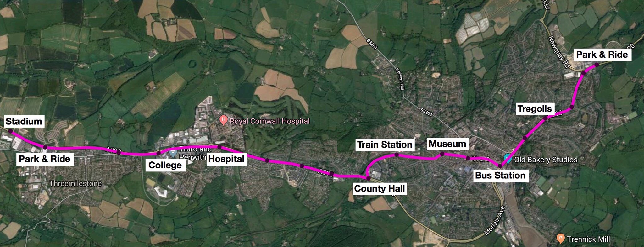 My tram system would follow the A390 from the new Stadium into the city, relieving a massively overcrowded road which is deadlocked at rush hours. There is already a park and ride system along this route but it’s poorly used and busses are still contributing to the traffic problem. From the stadium, the tram would stop at the park and ride, Truro College and Treliske Hospital (big sources of traffic) and New County Hall before turning into the city centre, stopping at Truro train station, Royal Cornwall Museum and the bus station. The tram would then pop out of the other side, ending up at the out of town shopping shopping centres and Park & Ride in the east.