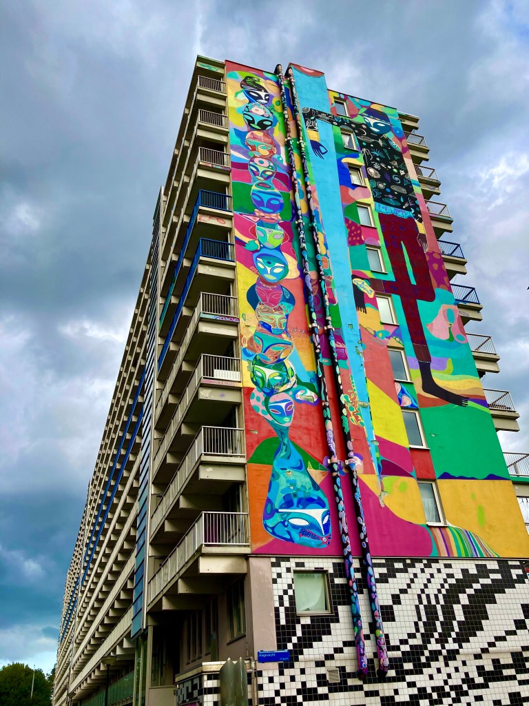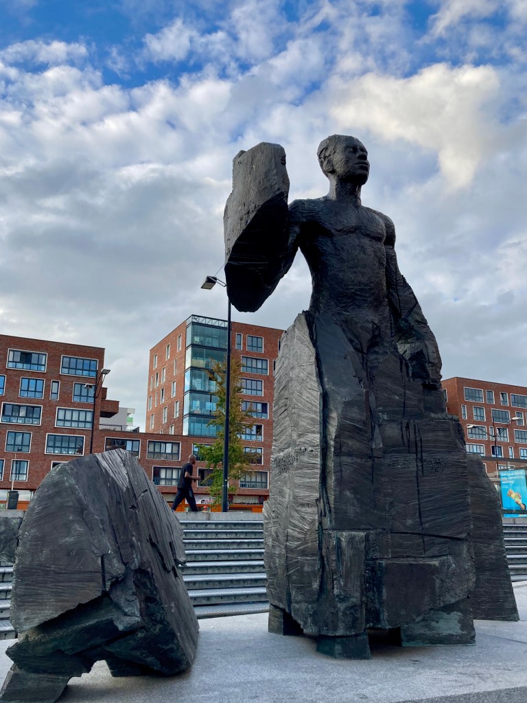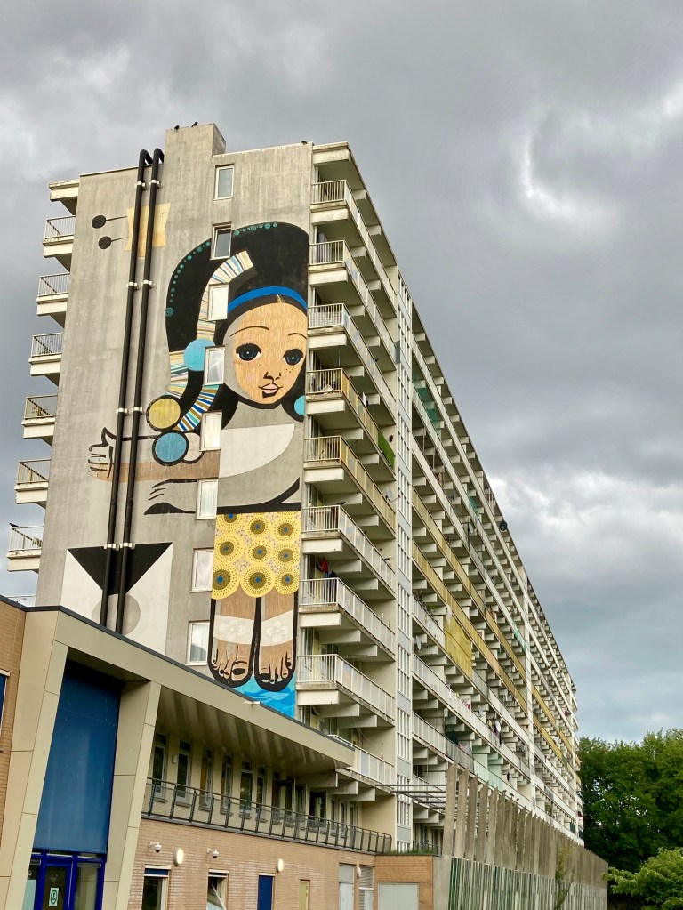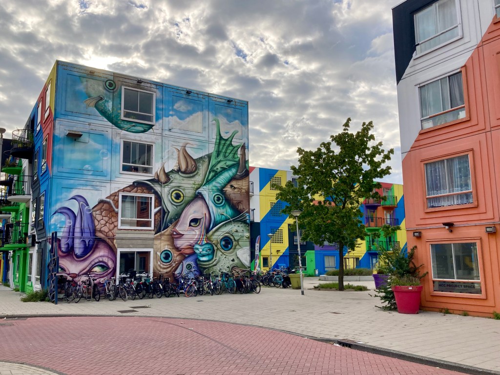 Walking back to my apartment to wait for my bike to be fixed, I can see why Bijlmer has become one of Amsterdam’s coolest neighbourhoods. The shift in focus from cars to bikes means wide open green spaces, flooded with sunlight, and the remaining tower blocks are divided by cycle paths and canals, softening their harsh exteriors. Here, the importance of public space is obvious. Statues and art installations are everywhere, and murals scale the buildings. Markets sell fresh produce and goods from around the world. The people of Bijlmer, in a very physical way, have reclaimed the concrete concourses and relegated the grey buildings to the background of vibrant community life. Another British student living in the area says it reminds him of Stratford, London: a diverse area encroached on by newer sports arenas (in Bijlmer’s case the Johan Cruijff ArenA – home to Amsterdam’s Ajax football club), shopping and entertainment complexes. But unlike many neighbourhoods, Bijlmer manages to retain its sense of community, punctuated by bustling markets, huge murals and diverse independent businesses. As my British friend puts it, ‘at least here I know I can still buy plantain and shea butter.’