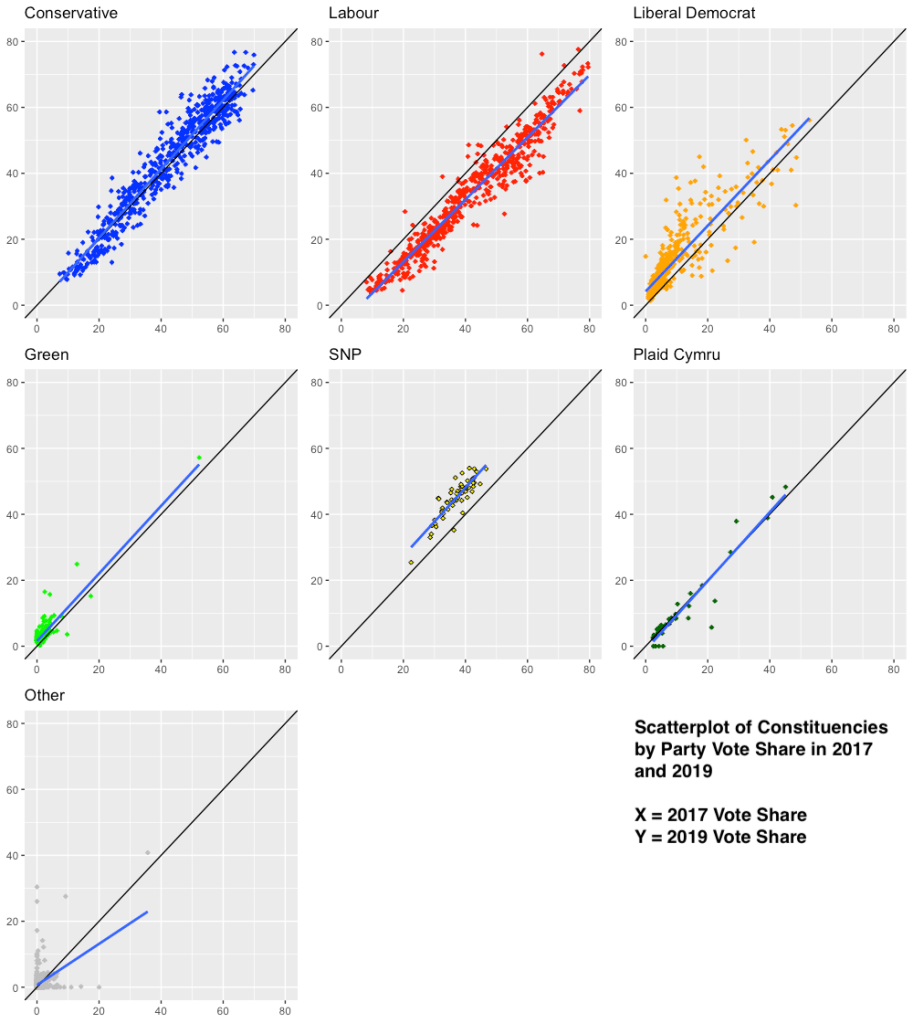 This is pretty unusual. Although there is often some correlation between election results in one election and party swing at the next, this is usually much smaller. For comparison, the same chart is reproduced for the change between 2017 and 2019, without the Brexit Party which stood no candidates in 2017: