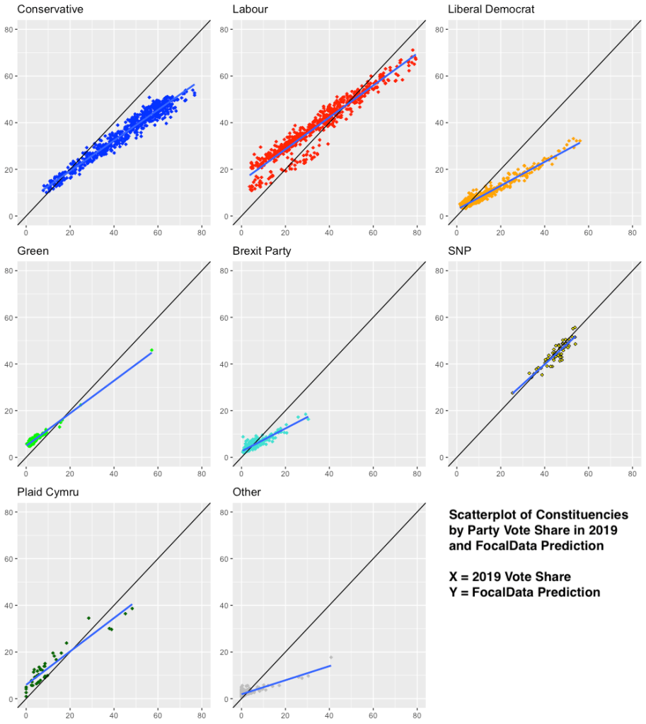 In the plots below, I use Pippa Norris’s past election results data to compare the FocalData prediction to the 2019 election results. In these plots, the x-axis is the 2019 election result and the y-axis is the FocalData predicted vote share. The black line represents x=y, as a visual aid. Points above x=y are constituencies where parties improved on their 2019 vote share in the FocalData projection. For each plot, a linear trend line shows how the FocalData model predicts parties performing relatively worse in their best seats, whilst relatively better in their worst seats (that is, the blue regression line tilts to the right of the black x=y line).