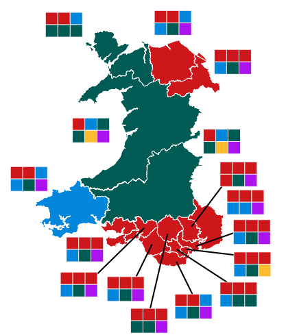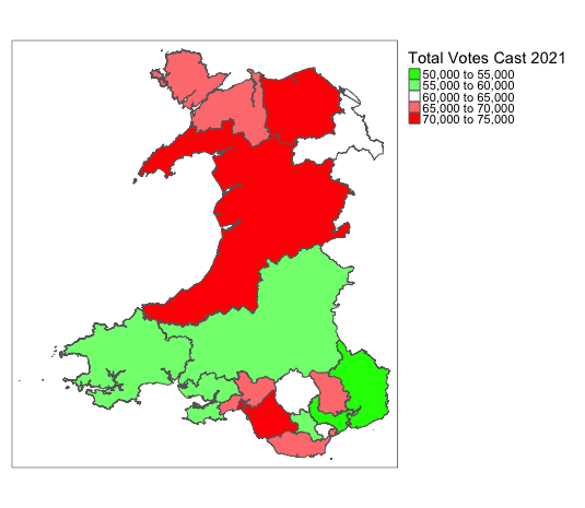 Admittedly, some of these are a bit ugly. I tried to combine pairs of more populated constituencies and triples of less populated constituencies. For example, I’ve paired Vale of Glamorgan, where 43,000 people voted in 2021, with Cardiff South and Penarth, where 36,000 voted to create one 6 member district with 79,000 votes. At the other end of the spectrum, I’ve grouped Cynon Valley, where 21,000 people voted, with Merthyr Tydfil and Rhymney (21,000) and Rhondda (23,000) for a 6 member district with . This has necessarily resulted in some malapportionment, which I tried to minimise.