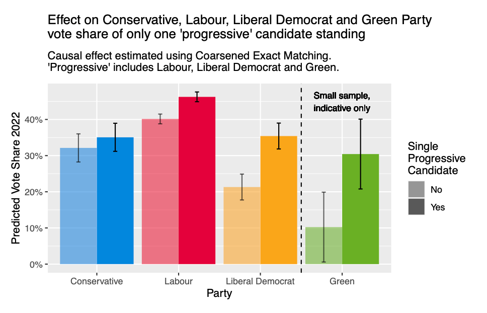Across England, hundreds of wards in the local elections had only one ‘progressive’ candidate (Labour, Liberal Democrat or Green). I have tried to estimate the effect that this had on their vote shares, using a technique called “Coarsened Exact Matching” (CEM).