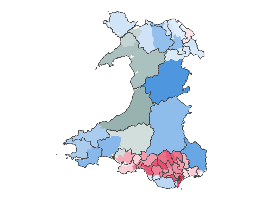 * Quasi-binomial regression with each party’s vote as a percentage of the total population (rather than votes) as the dependent variable. This means party votes and turnout are modelled together. Each model has between 2 and 5 variables, including % age 18-49, % Welsh speaking, % identifying as British only, % working in agriculture, % born in Wales, average level of household deprivation, % with no qualifications or level one qualifications and % with level 4 or higher qualifications.