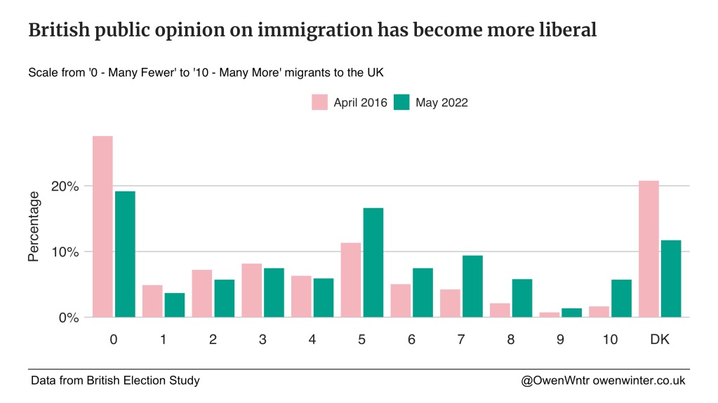 But it is not just salience which has shifted, public opinion of migration has too. Below is data from the British Election Study survey immediately before the EU Referendum and from its most recent survey in May 2022. Here we can see how the number of people saying they would prefer ‘0 – Many Fewer’ immigrants has fallen from 28% to 19%. The number responding 5, indicating a preference for migration to stay at the same level, has risen from 11% to 17%. And the number answering ’10 – Many More’ has gone from 2% to 6%.