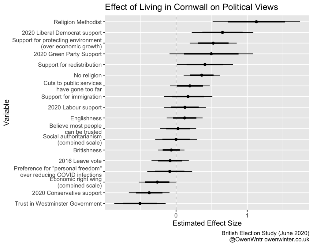 The survey data here gives some tentative support to the idea of distinctive Cornish political values, when demographic variables are held constant. Comparison with Devon suggests a substantial difference between neighbouring counties and more pronounced effect sizes for Cornwall. As Cornish identification grows, it will be interesting to see whether a more pronounced political Cornishness develops.