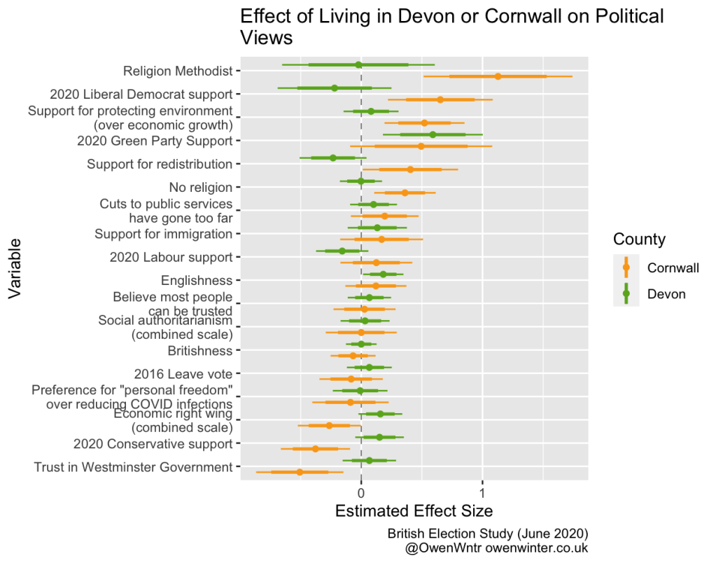 The plot above shows how fewer variables have a pronounced county effect in Devon than Cornwall. The biggest divergence is on Methodism, which is predictable. After that, the greatest difference is the effect on the Liberal Democrats. This is more surprising, given substantial Lib Dem support in Devon in the past. On political attitudes, Devon has the opposite effect to Cornwall on support for redistribution, trust in Westminster, and right-wing economic values. While Cornwall has a distinctive left-wing skew on economic issues, Devon leans further to the right.