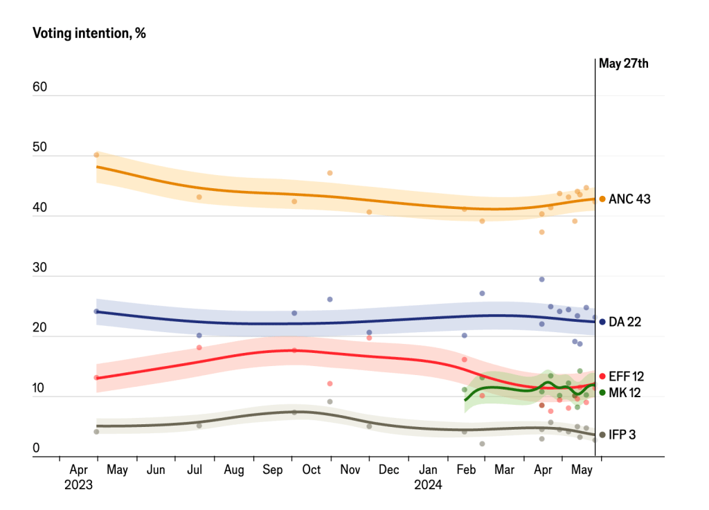 I produced data behind The Economist’s South Africa polling average. The tracker used an inverse variance-weighted average of a cross-validated Generalised Additive Model and a simple moving average with exponential smoothing.