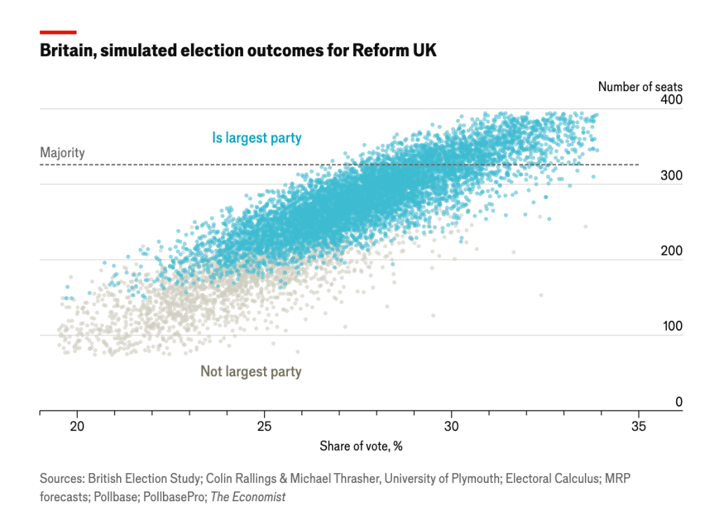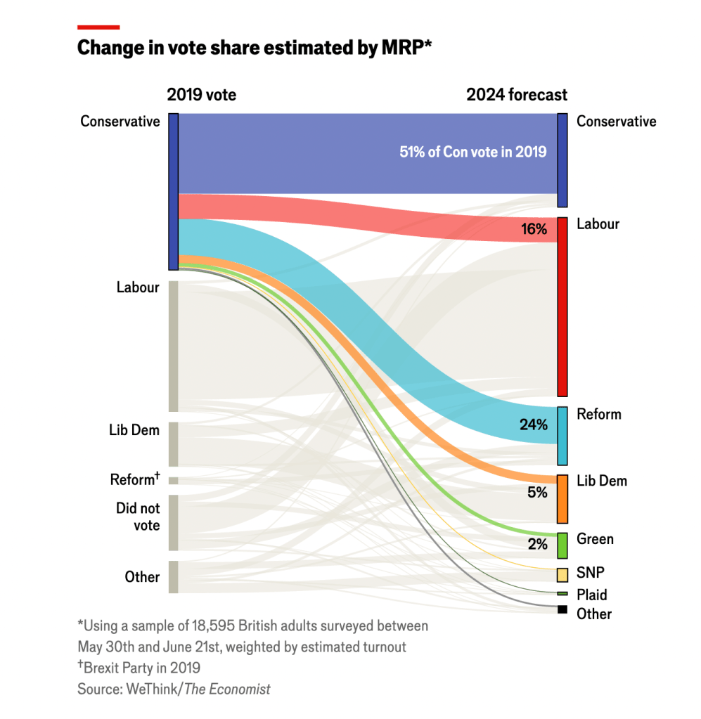 I produced The Economist’s MRP for the 2024 General Election, using data from WeThink. The model forecast a Labour majority of 280, with 465 Labour MPs, 76 Conservative, 53 Liberal Democrat, 29 SNP, 3 Reform, 3 Green and 3 Plaid Cymru. The analysis from the MRP fed into The Economist’s final predictions, which I wrote up here.