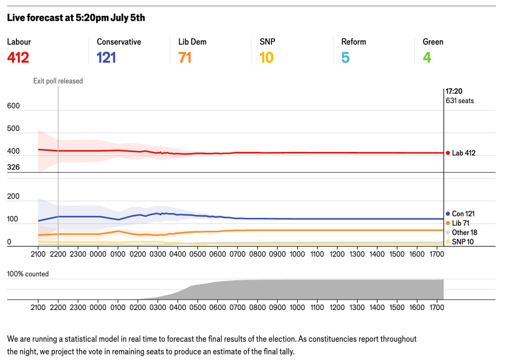 For the 2024 General Election, I produced a live forecast based on reported election results. The model started from our pre-election forecast, updated with the exit poll, then used Bayesian updating to produce new estimates as results were made available. It correctly forecasted that Labour would win around 412 seats from 3am and was closer to the final Conservative and Reform UK tally than BBC projections for much of the night.