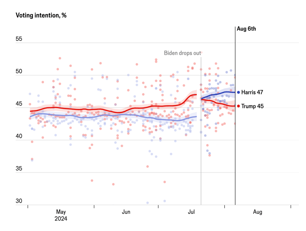 After President Biden’s withdrawal from the election, I produced a poll tracker to track the race between Donald Trump and Kamala Harris. I adapted the methodology used by Jack Bailey and Luke Mansillo, which was originated by Simon Jackman. Their approach treats each poll as an imperfect estimate of some “true” support for each candidate, which takes a random walk from election to election. A Bayesian MCMC model is used to estimate the “true” voting intention, given recent polls. The model takes into account differences in methodology between polls and the partisan tilt of individual polling firms’ output. This approach allowed me to include a discontinuity for Biden’s withdrawal, letting the estimated voting intention jump on 21st July 2024, while retaining useful info from Biden-Trump polling.
