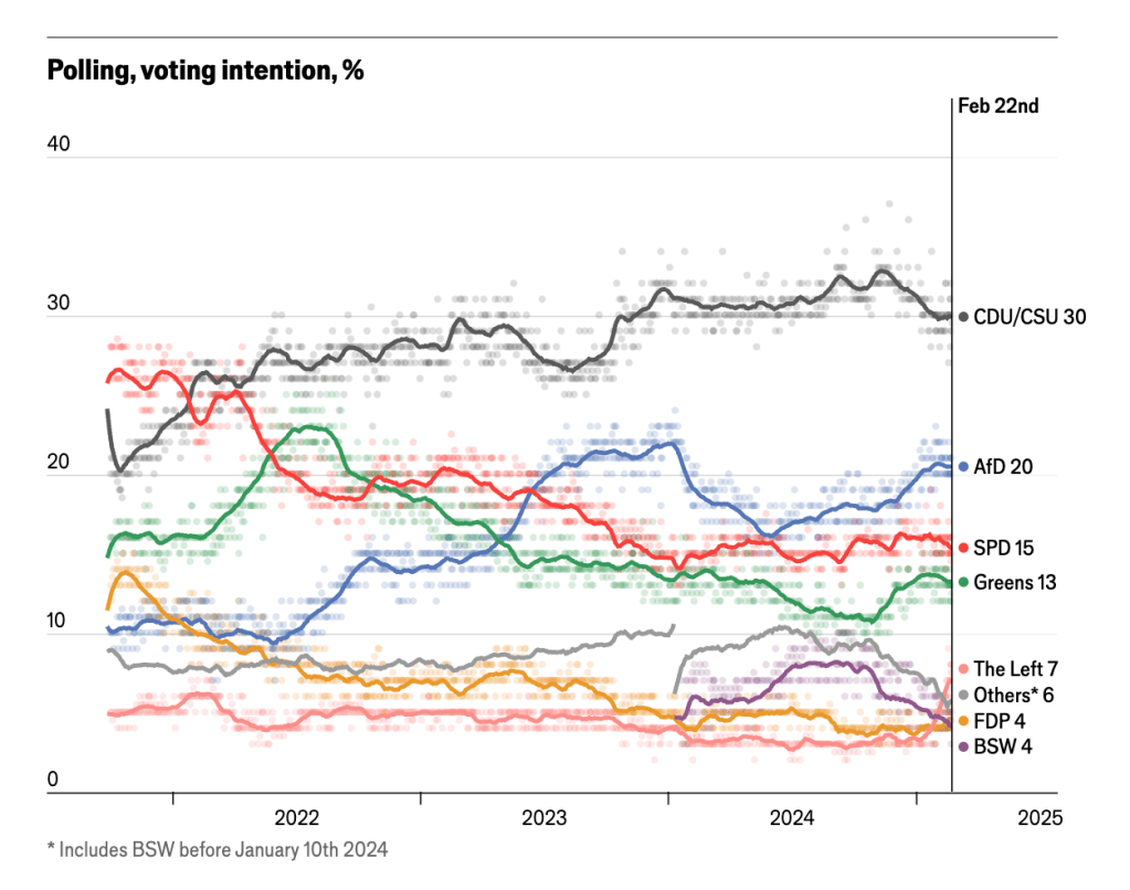 The Economist produced a polls-based forecast of the 2025 German election. I maintained and tweaked the model, largely built by Philipp Hauber and G Elliott Morris, in the run-up the election, which contributed to our reporting during the campaign.