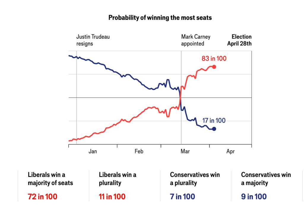 I produced a forecast of Canada’s federal election. The forecast works using uniform swing based on national and provincial polling. Its structure is hierarchical, with ridings nested in provinces nested in the country as a whole. 10,001 simulations are drawn from correlated distributions within and across parties, ridings and provinces.