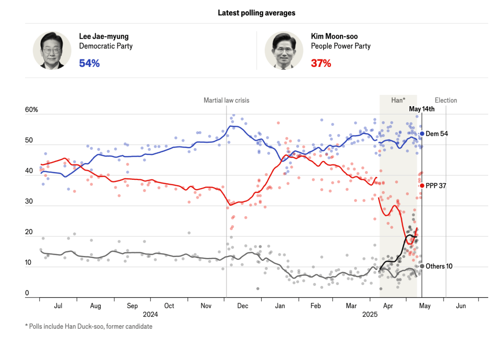 Using similar methods as our US, German and Canadian poll trackers, I produced a tracker of the South Korean presidential election. This is an adapted version of the methodology advanced by Jack Bailey and Luke Mansillo, which was originated by Simon Jackman.