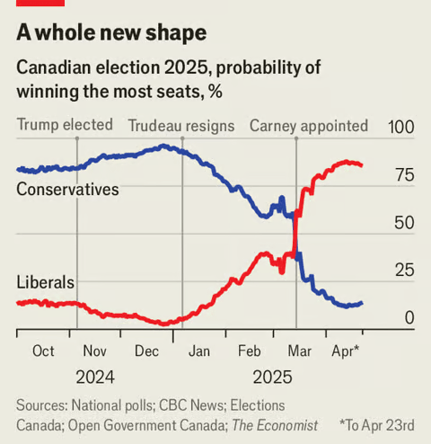 “Captain Canada” Carney gains in the Maple Leaf v MAGA election – April 2025